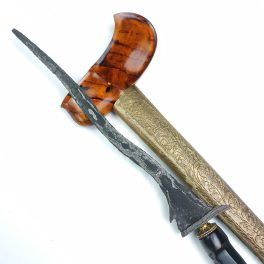 Tilam Upih Tirto Tumetes Pajajaran Dhapur: Tilam Upih Pamor: Tirto Tumetes Tangguh: Pajajaran Warangka: Gayaman Yogyakarta Kayu Timoho Pelet Sampir Hulu/Handle: Kayu Kemuning Bang Pendok: Blewah Kuningan Mamas Mendak: Bejen Kuningan