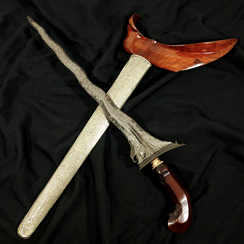 Rp 3.111.000Keris Singo Barong Kinatah Emas Pamor Pedaringan Kebak Nginden Kawung Garap Istimewa Dhapur Keris (jenis bentuk keris) : Singobarong Luk 5 Pamor (motif lipatan besi) : Pedaringan Kebak Nyutro Lembut (kinatah tembaga lapis emas) Tangguh (perkiraan masa pembuatan) : Kamardikan Alusan (Dipesan seacara khusus) Panjang Bilah : 37 cm Warangka : Ladrang Surakarta Kayu Cendana… selengkapnya