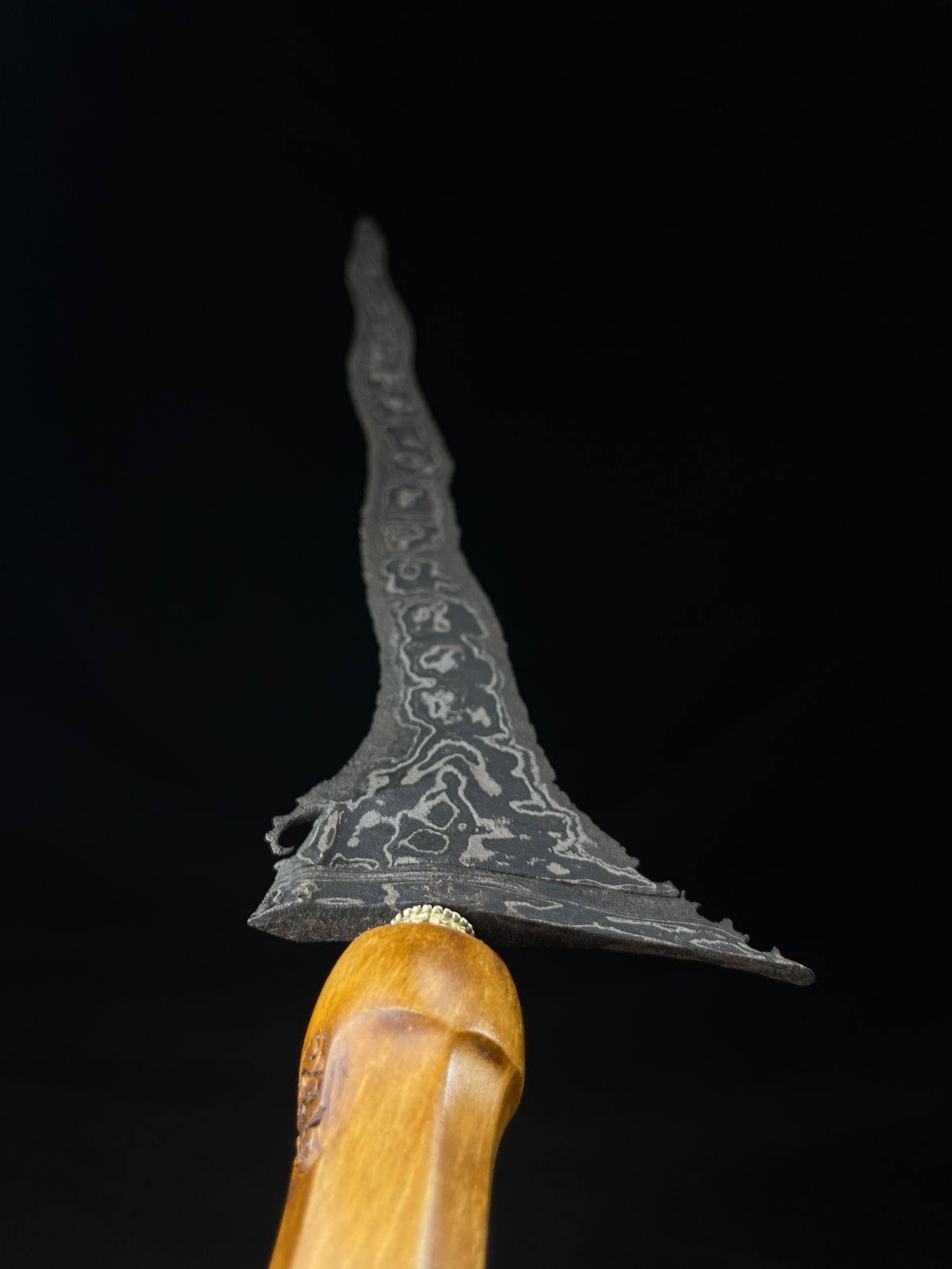 Keris ini memperlihatkan karakter kuat tangguh Cirebon—salah satu tradisi perkerisan pesisir utara Jawa yang kaya warna budaya. Prejengan bilahnya memancarkan aura wingit namun tetap teduh, dengan luk yang tidak terlalu rengkol sehingga menghasilkan siluet proporsional dan stabil. Keunikan ricikan berupa jenggot menjadi ciri khas yang menegaskan identitasnya sebagai karya empu dari wilayah Cirebon. Tekstur besi yang hitam kecoklatan, sedikit kering, dan pamor yang kelem menunjukkan proses penyepuhan khas daerah pesisir yang terpengaruh kadar garam tinggi dan kondisi geografis setempat.