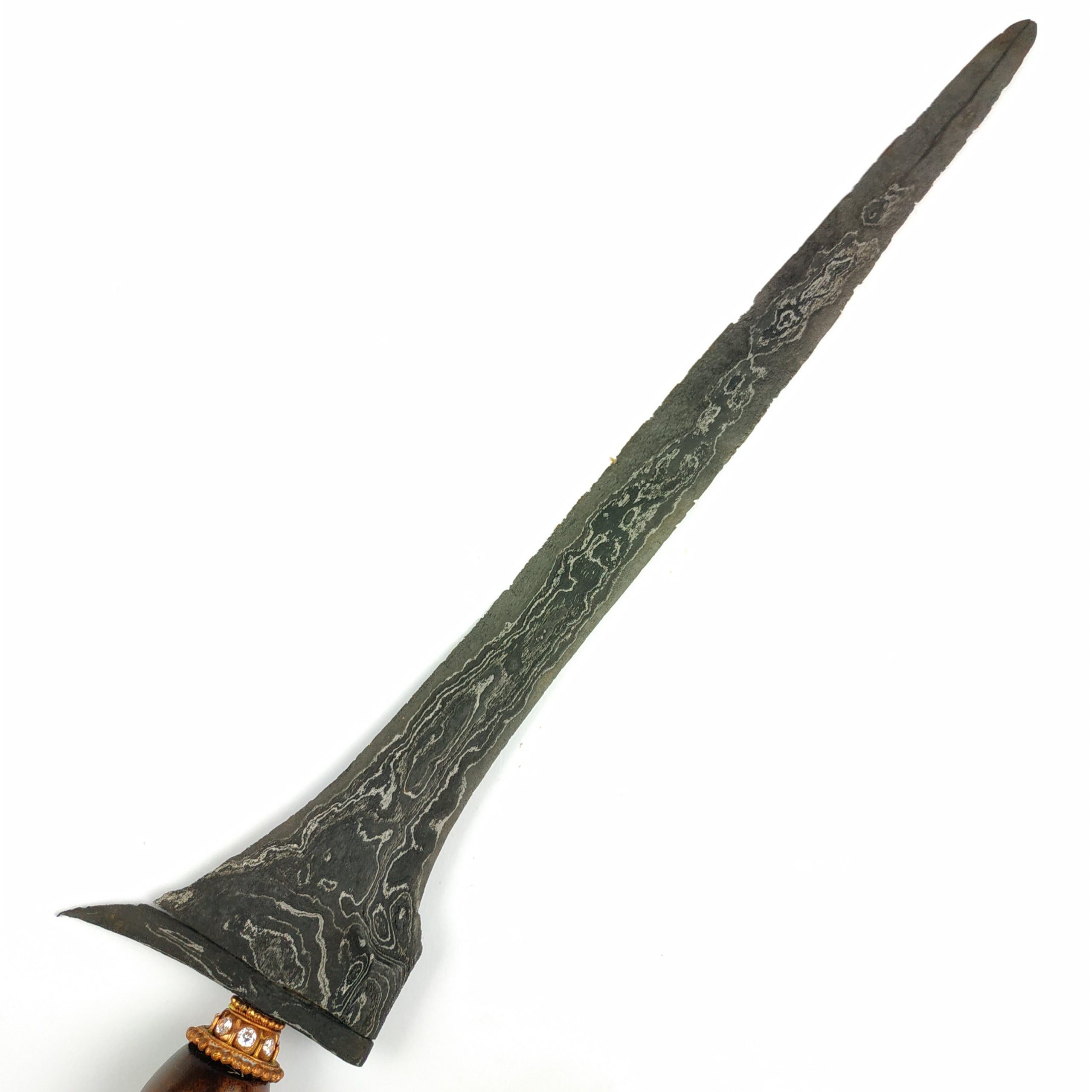 Keris Sempana Luk 9 Pamor Setro Banyu Sepuh Kuno Dhapur Keris (jenis bentuk keris) : Sempono Luk 9 Pamor (motif lipatan besi) : Setro Banyu / Banyu Mili Tangguh (perkiraan masa pembuatan) : Blambangan Era Majapahit (Abad XIII) Panjang Bilah : 30 cm (pesi utuh masih panjang original) Warangka : Ladrang Surakarta Kayu Timoho Kuno… selengkapnya