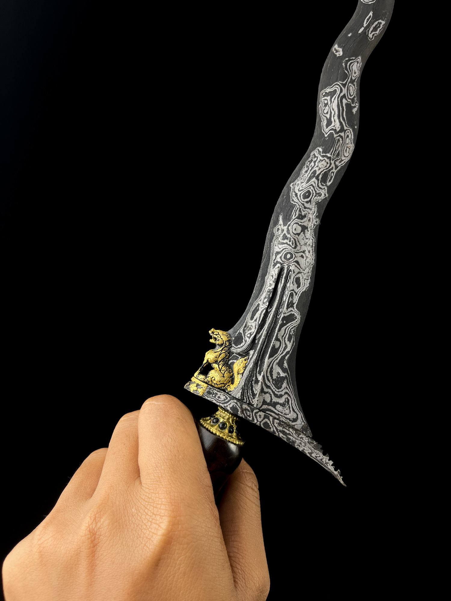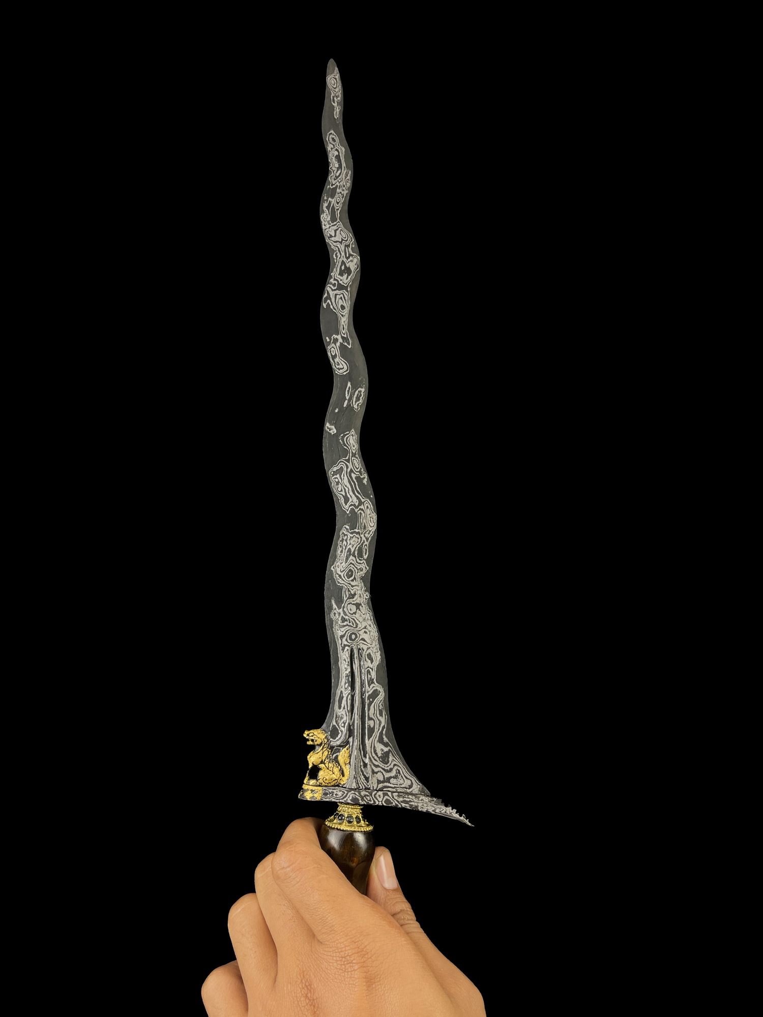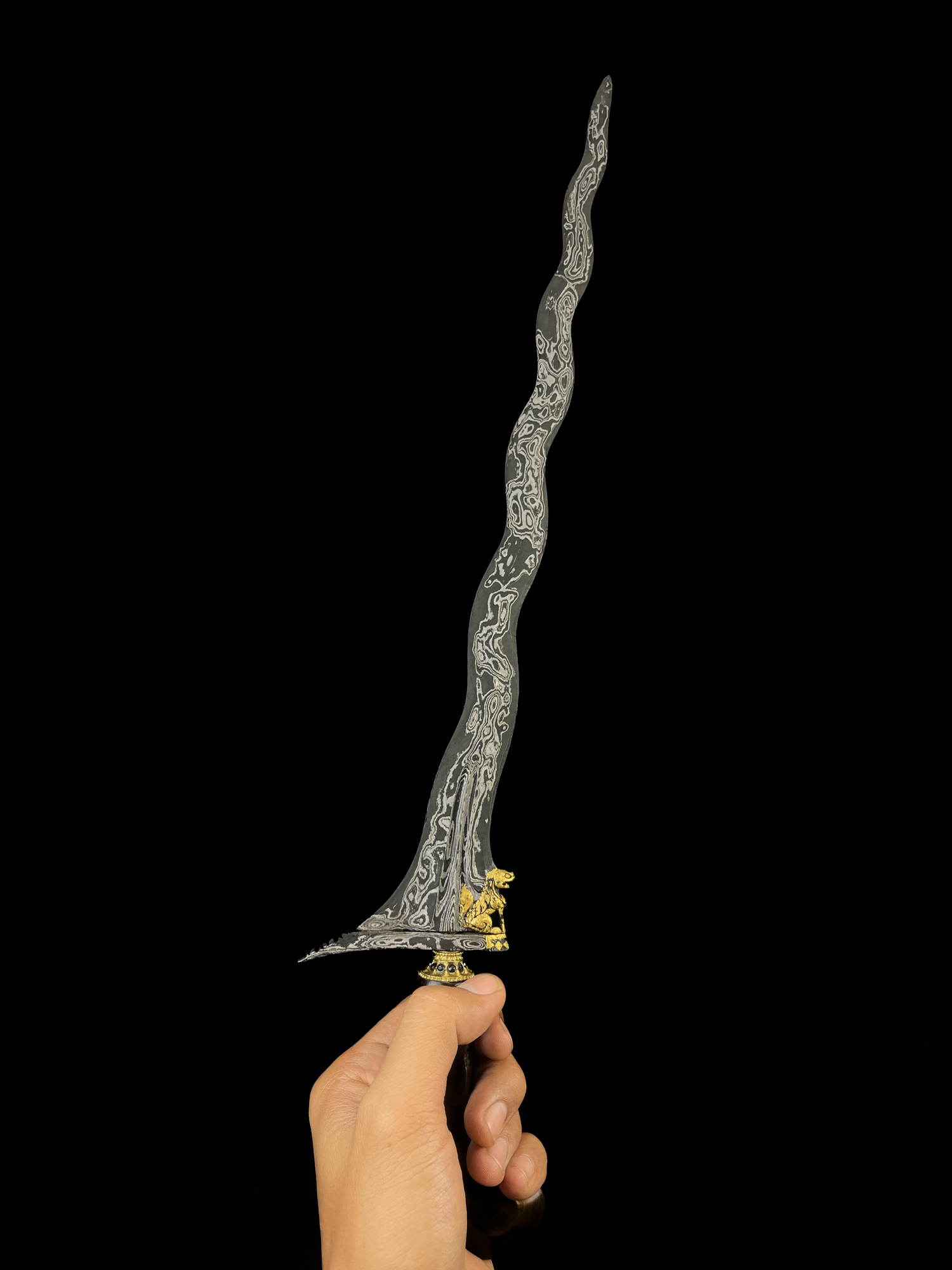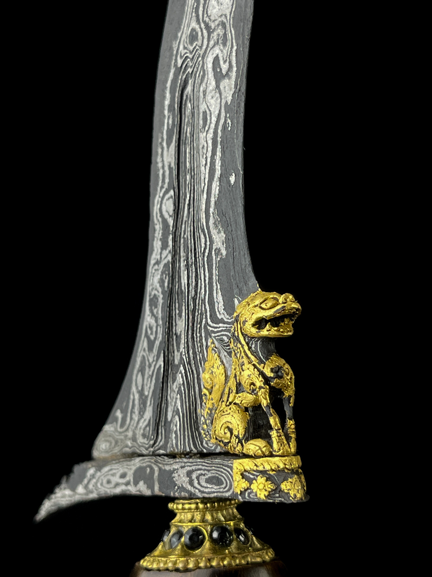 Keris Singa Barong merupakan salah satu pusaka Nusantara yang dikenal istimewa karena gandiknya diukir menyerupai singa jantan dengan simbol kejantanan yang tegas. Figur singa pada gandhik ini memiliki kemiripan dengan kilin—makhluk mitologis penjaga gerbang dalam tradisi Tiongkok—yang menunjukkan adanya jejak pengaruh budaya China dalam perkembangan seni tosan aji di Nusantara. Kehadiran motif ini bukan sekadar ornamen, melainkan simbol penjaga, kekuatan, dan kewibawaan.