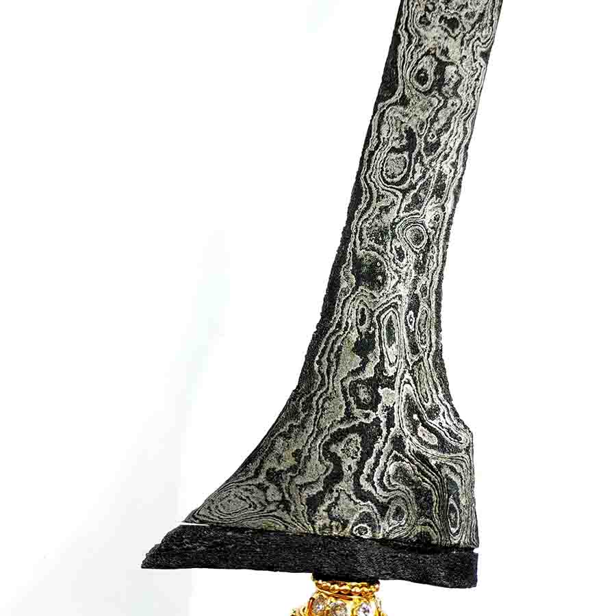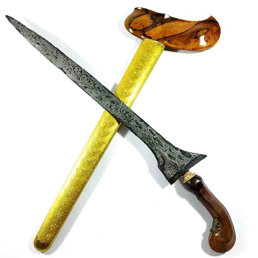 Rp 750.000Pandito Semedi Damar Murub Kinatah Emas Dhapur: Putut Pandita Semedi Damar Murub Pamor: Pedaringan Kebak Tangguh: Pajajaran Warangka: Gayaman Surakarta Kayu Timoho Hulu/Handle: Kayu Kemuning Bang Pendok: Bunton Kuningan Mamas Mendak: Kendit Kuningan
