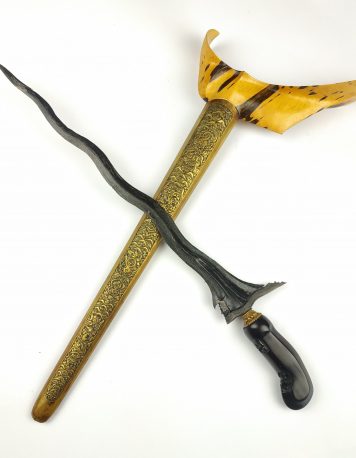 Keris Naga Manglar Kinatah Emas Yasan PB Dhapur Keris (jenis bentuk keris) : Naga Manglar Pamor (motif lipatan besi) : Ngulit Semangka Tangguh (perkiraan masa pembuatan) : Yasan PB (Pakubuwono) Panjang Bilah : 35,5 cm Kinatah Emas Asli, Garap Halus Istimewa Warangka : Gayaman Surakarta Handle / Gagang : Solo (Surakarta) Pendok : Blewah Surakarta… selengkapnya