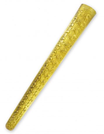 Pendok Keris Kuningan Motif Modang – Motif Modang, mengandung makna kesaktian untuk meredam angkara murka, yaitu sebelum mengalahkan musuh dari luar harus mengalahkan musuh yang datangnya dari dalam sendiri. Tentu saja keris juga memiliki keterkaitan dengan batik. Yang mana batik juga merupakan salah satu aset budaya Nusantara yang sama ajinya dan sama berhgarganya dengan keris. Maka pendok ini memiliki simbol keterkaitan antara keris dan batik. Yang disimbolkan melalui motif pada pendok yang merupakan jenis motif batik Modang.
