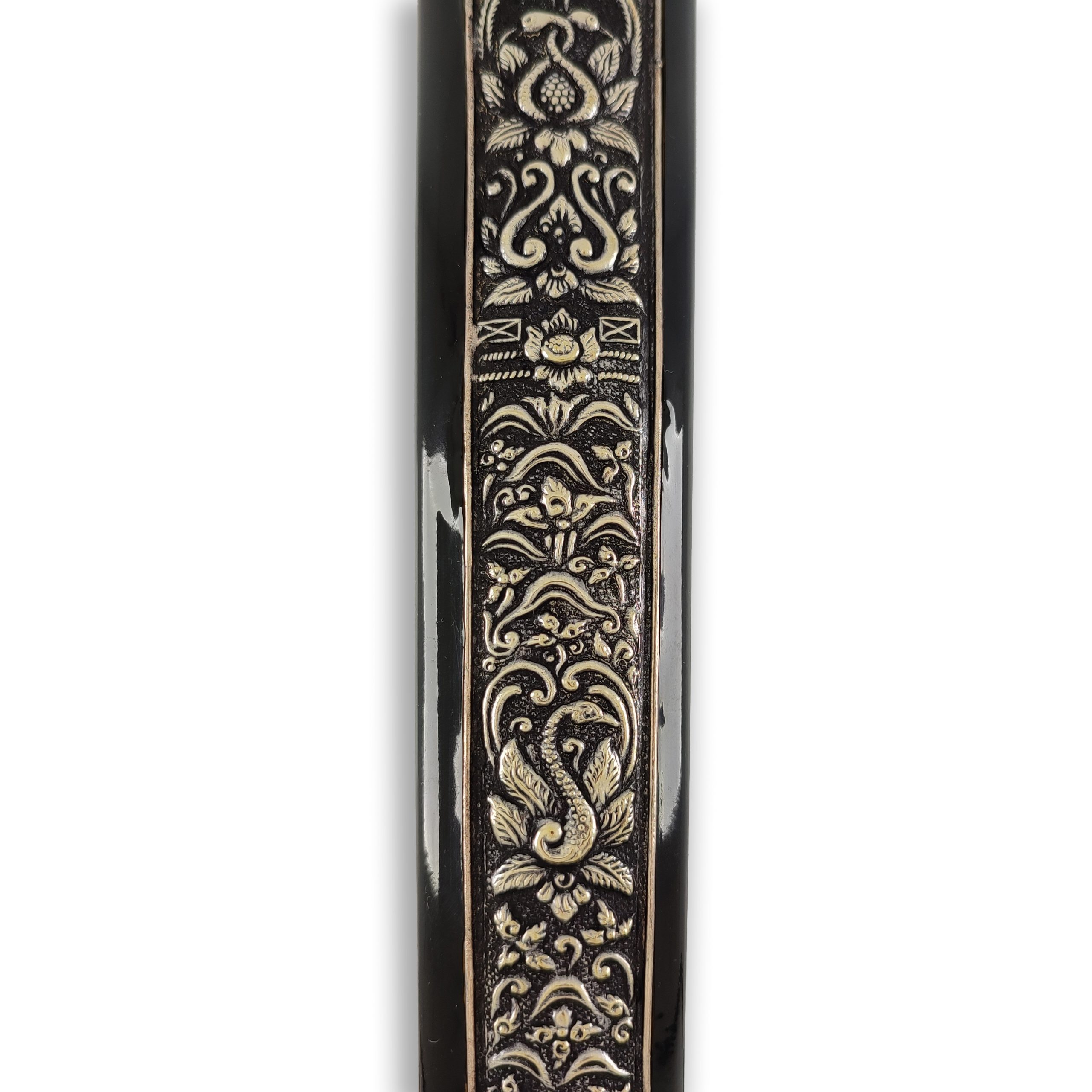 Tentu saja warna hitam adalah warna yang selaras dan cocok dipadukan dengan warna apapun. Karena warna hitam adalah warna netral namun bukan berarti warna hitam pada pendok ini merupakan warna mati jika dipadukan dengan warna kayu warangka.