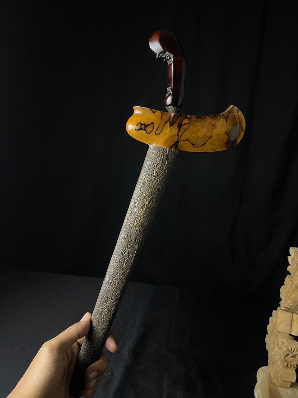 Rp 1.400.000Tilam Upih Pamor Wos Wutah Putri Kinurung Dhapur: Tilam Upih Pamor: Beras Wutah + Putri Kinurung Tangguh: Pajajaran Warangka: Gayaman Surakarta Kayu Timoho Hulu/Handle: Kayu Timoho Pendok: Blewah Kuningan Mendak: Kuningan