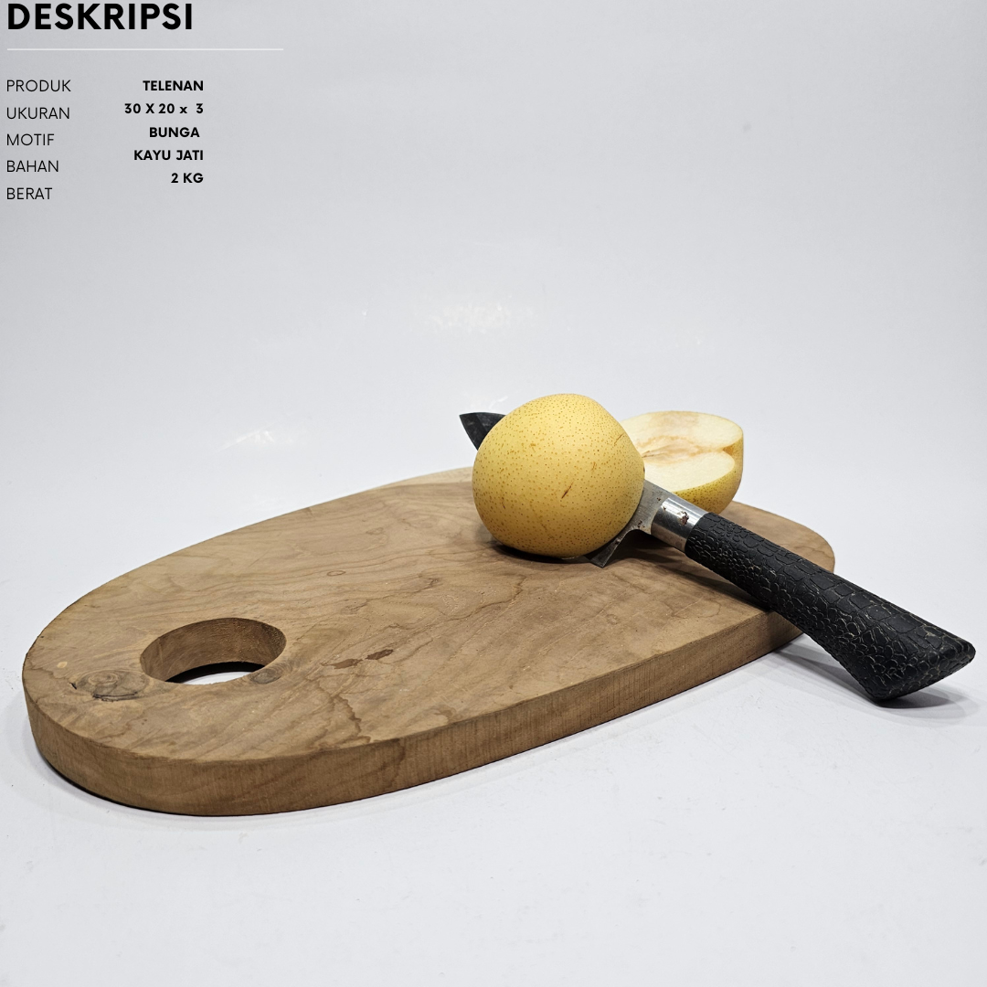 Telenan kayu jati tidak hanya menjadi alat praktis di dapur, tetapi juga sebuah elemen dekoratif yang memperkaya pengalaman memasak. Dibuat dari kayu jati yang kuat dan tahan lama, telenan ini menjadi pilihan populer bagi mereka yang menghargai keindahan alam dan kepraktisan dalam satu kesatuan.