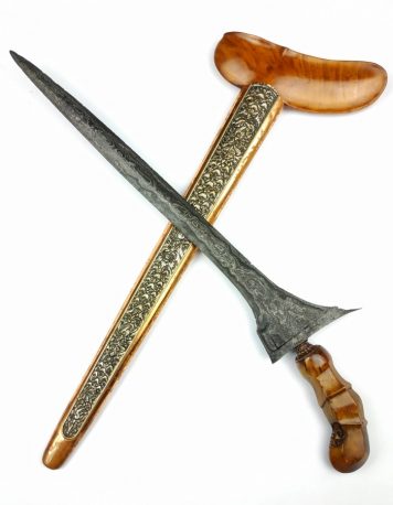 Keris Betok Sombro Pamengkang Jagad Pamor Setro Banyu Dhapur Keris (jenis bentuk keris) : Betok Sombro Pamor (motif lipatan besi) : Setro Banyu / Banyu Mili / Ilining Warih (Pamengkang Jagad) Tangguh (perkiraan masa pembuatan) : Pajajaran (Abad XIII) Panjang Bilah : 21 cm Warangka : Sandhang Walikat Kayu Rose Wood Handle / Gagang :… selengkapnya