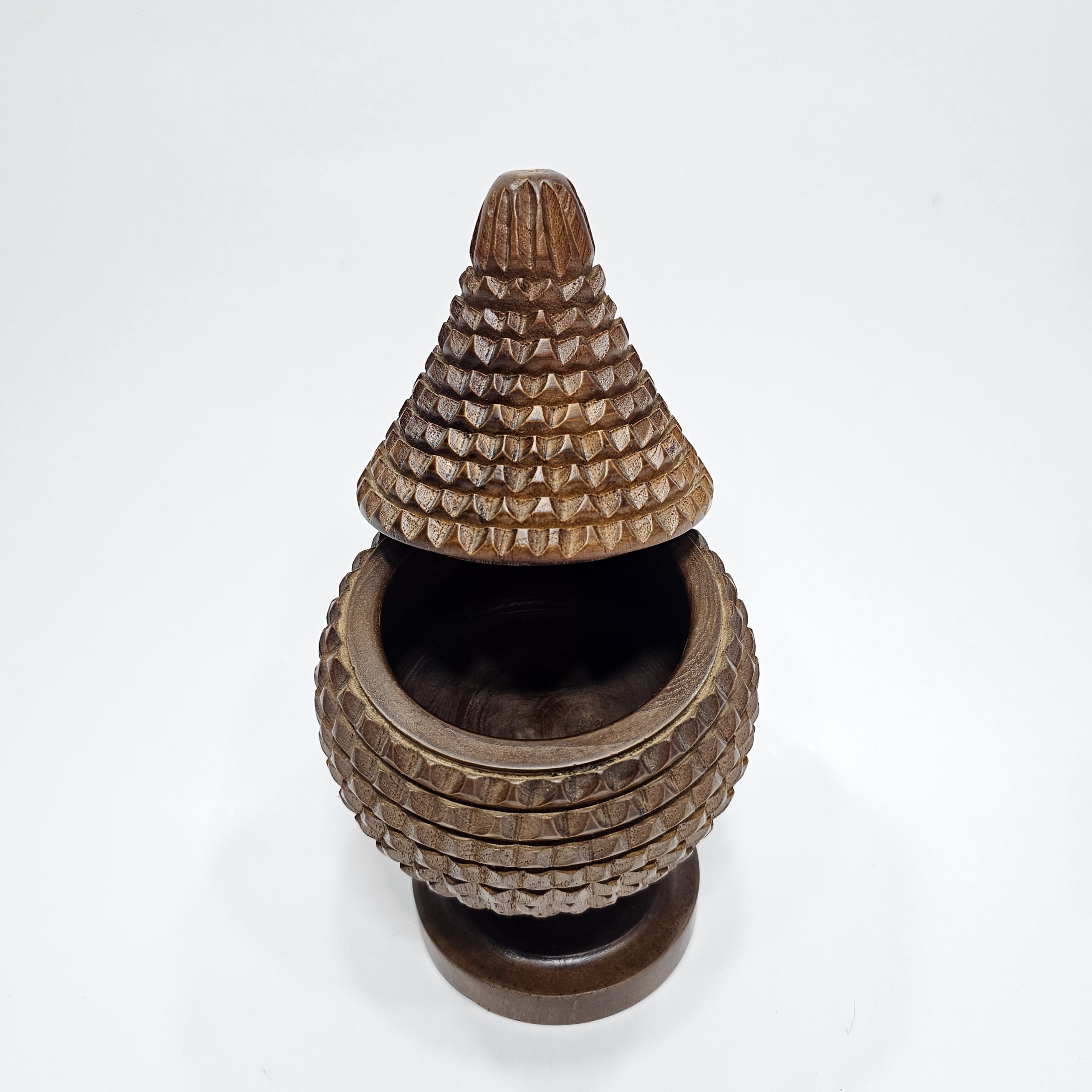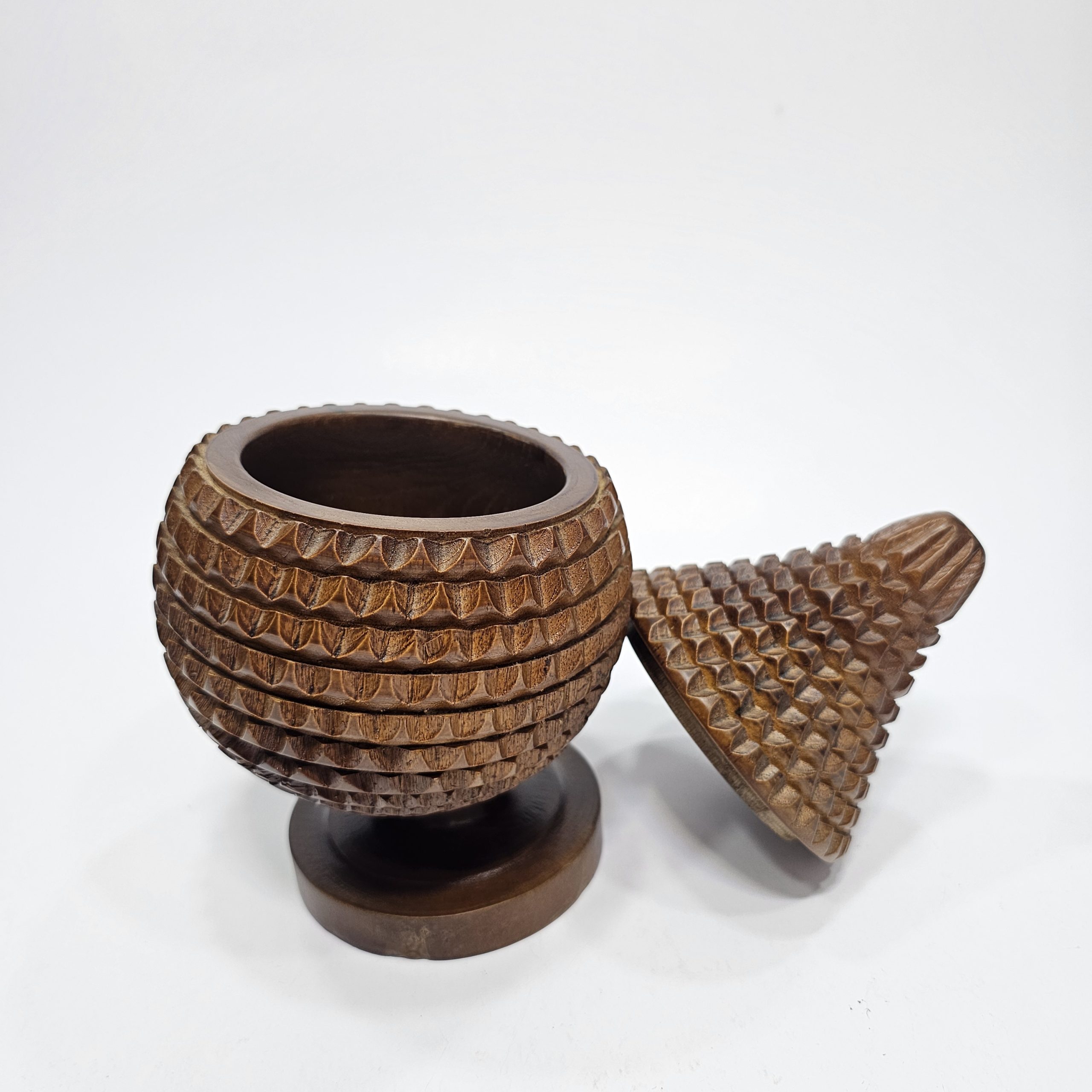 Toples kayu jati dengan motif buah salak tidak hanya merupakan wadah penyimpanan praktis, tetapi juga sebuah karya seni yang memadukan keindahan alam dan fungsionalitas. Dengan menggunakan kayu jati, toples ini menawarkan kekuatan dan daya tahan yang luar biasa, sementara motif nanasmemberikan sentuhan unik yang mencerminkan kekayaan budaya dan alam tropis.